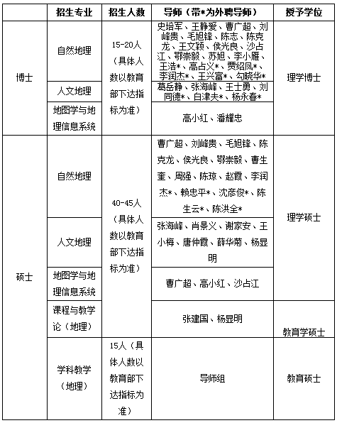 学科教学(地理),实行导师组招生培养,本学科在地理学科教育理论研究,尤其是中学地理教材和中学地理教学研究方面取得了一系列成果,在中学地理教师培训、中学地理教学指导等方面取得了显著成效。近年来,先后主持、参与国家级课题研究项目4项、省级项目3项。在《中国教育学刊》、《高教探索》、《教育理论与实践》、《考试研究》、《学术探索》、《贵州民族研究》等国内外学术刊物发表学术论文30余篇,参编新课标中图版初中《地理》教材、初中地理《教师教学用书》、高中《地理》教材、高中地理《教师教学用书》以及《地理新课程教学论》、《中国地理大百科全书·青海湖卷》、《自然地理读本》等书籍15本,出版专著《教师教材理解论》1部。目前已在中学地理教学研究、中学地理教材研究等研究领域形成了鲜明的研究特色和培养方向。