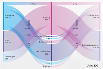 本研究采用微观调查数据(图1),对具有典型社区城中村进行家庭直接碳排放研究,计算碳排放的能源消费结构和终端用途(图2)。采用多元回归的方法对城中村家庭碳排放影响因素进行分析,并对城中村低碳可持续发展提出针对性建议。研究结果表明:电力碳排放在城中村相对较高,天然气和液化石油气比例相对较低,主要应用于炊事,这是因为城中村天然气基础设施不完善;家庭新能源的应用比例很低,存在很少一部分家庭中使用太阳能热水器。在碳排放驱动机制上,家庭特征、家庭规模、家用电器数量与碳排放存在显著的正相关关系,区别于以往研究,本研究发现收入对家庭碳排放并没有显著影响。